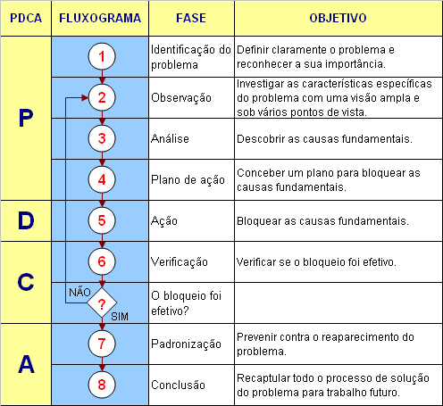 O MASP encontra-se distribuido dentro do PDCA (Plan/Do/Check/Act) da seguinte maneira: