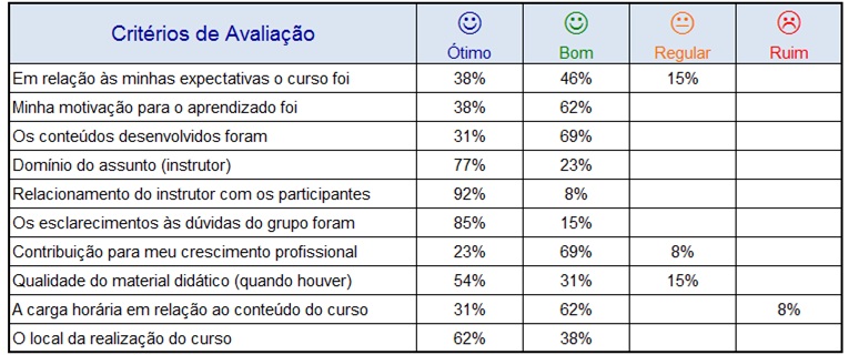 Resultado da Avaliação de Reação deste curso