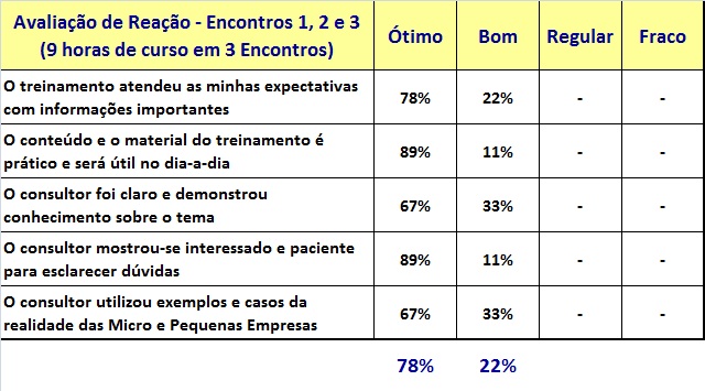 Em atendimento à uma demanda do Sebrae-MG, a AdvanceConsultoria.com realizou nos dias 5, 6 e 7 de Outubro de 2010, o curso presencial Gestão da Inovação – Inovar para Competir, na cidade de São Sebastião do ParaÃso, com carga horária de 9 horas de treinamento distribuÃdo em 3 Encontros de 3 horas, mais 4 horas de Oficina, cujo Ãndice geral de Avaliação de Reação alcançou uma ótima pontuação (78% Ótimo + 22% Bom + 0% Regular + 0% Fraco).